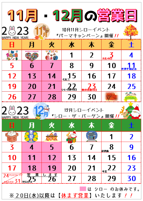 ついでに12月の営業日も掲載しましたので、年末のご予定にシローでのカット&ケアを入れてください。