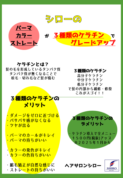 HOME ヘアサロン シローについて メニュー ご利用の流れ お問い合わせ Blog 『カラー・パーマ・ストレートに関する お知らせ』 昨年10月より勉強してきました『髪を綺麗にすための勉強会』にてカラー・パーマ・ストレートをダメージを軽減・髪を強化するためにケラチンの導入を決めましたそれに伴い今月1月からカラー・パーマ・ストレートの料金の改訂をいたしますカラー・パーマ・ストレート料金に一律1,500円アップとなります新たにグレードアップしたカラー・パーマ・ストレートをご堪能ください!! 2025年1月8日 « 前の記事へ 次の記事へ » 最近の投稿 2026 シローガラポン大抽選会 ʜᴀᴘᴘʏ ɴᴇw ʏᴇᴀʀ̆̈ ⛩ 2025ありがとうございました🐍✨ *↟⍋*↟𝑀𝑒𝑟𝑟𝑦 𝐶ℎ𝑟𝑖𝑠𝑡𝑚𝑎𝑠*↟⍋*↟ クリスマスが今年もやってくる𓍄𓂃𓈒* アーカイブ 2026年1月 (2) 2025年12月 (7) 2025年11月 (12) 2025年10月 (5) 2025年9月 (2) 2025年8月 (2) 2025年7月 (1) 2025年6月 (2) 2025年5月 (1) 2025年4月 (2) 2025年3月 (1) 2025年2月 (2) 2025年1月 (4) 2024年11月 (2) 2024年10月 (4) 2024年9月 (1) 2024年8月 (1) 2024年5月 (2) 2024年4月 (1) 2024年3月 (1) 2024年2月 (2) 2024年1月 (1) 2023年12月 (4) 2023年11月 (2) 2023年10月 (1)