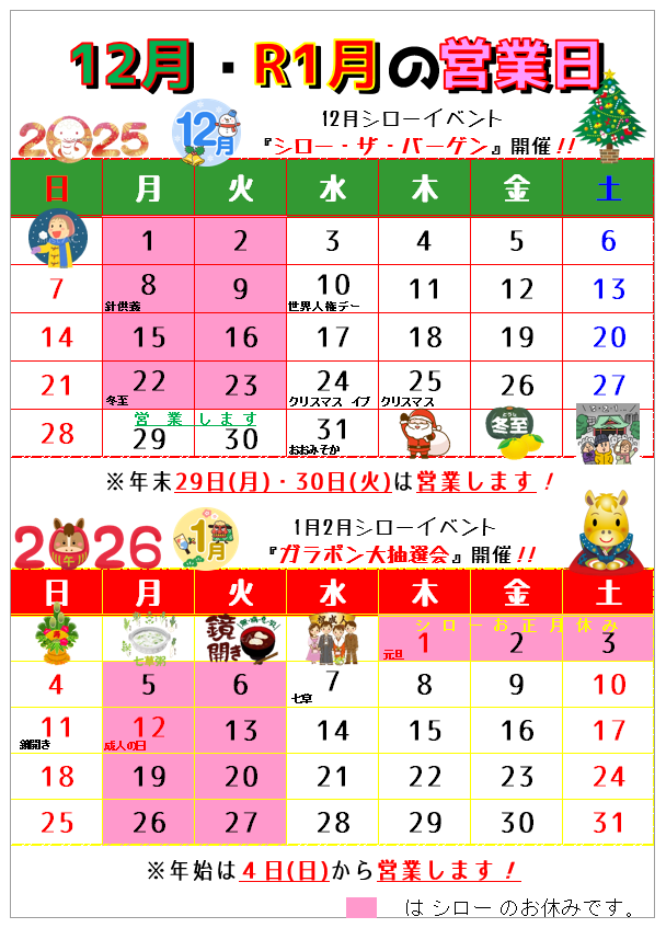 HOME ヘアサロン シローについて メニュー ご利用の流れ お問い合わせ Blog 12月の営業 【12月の営業日】です𓂃𓈒 ❅ * 寒くなってきたと思ったらもう12月です❅.☃︎.’.°皆様いかがお過ごしでしょうか??今年も残り僅かになってきましたが、シローは変わらず元気に営業しております💪🏻✨今年も年末は24(水)~31(大晦日)まで休むことなく営業致します!新年を気持ちよく迎えられるように、シローで整えていきませんか??年末のご予約も少しずつですが埋まってきています。ご予約はお早めに💈 2025年12月1日 « 前の記事へ 次の記事へ » 最近の投稿 2026 シローガラポン大抽選会 ʜᴀᴘᴘʏ ɴᴇw ʏᴇᴀʀ̆̈ ⛩ 2025ありがとうございました🐍✨ *↟⍋*↟𝑀𝑒𝑟𝑟𝑦 𝐶ℎ𝑟𝑖𝑠𝑡𝑚𝑎𝑠*↟⍋*↟ クリスマスが今年もやってくる𓍄𓂃𓈒* アーカイブ 2026年1月 (2) 2025年12月 (7) 2025年11月 (12) 2025年10月 (5) 2025年9月 (2) 2025年8月 (2) 2025年7月 (1) 2025年6月 (2) 2025年5月 (1) 2025年4月 (2) 2025年3月 (1) 2025年2月 (2) 2025年1月 (4) 2024年11月 (2) 2024年10月 (4) 2024年9月 (1) 2024年8月 (1) 2024年5月 (2) 2024年4月 (1) 2024年3月 (1) 2024年2月 (2) 2024年1月 (1) 2023年12月 (4) 2023年11月 (2) 2023年10月 (1)