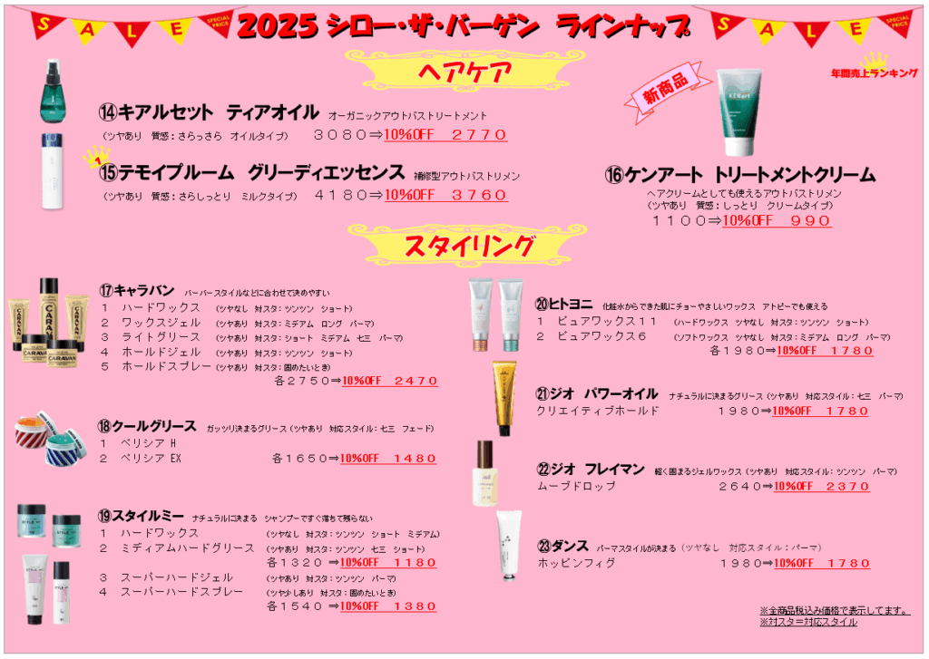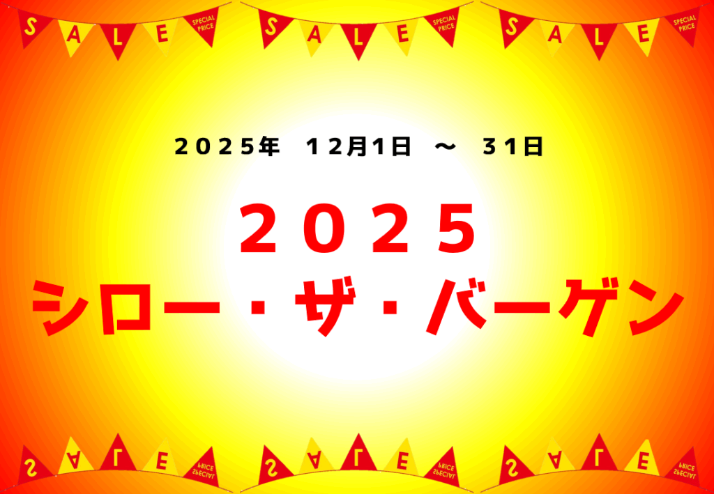 HOME ヘアサロン シローについて メニュー ご利用の流れ お問い合わせ Blog 『2025 シロー・ザ・バーゲン』 やってまいりました!🎊『シロー・ザ・バーゲン』🎊年に一度の大イベント🎪シローで取り扱っている商品が全て!10%~15%OFFになります🥳✨️今年は新たな商品も登場!バーゲンは31日(大晦日)まで開催されます⸜︎👍︎⸝商品の詳細、お問い合わせはシローまで💈 2025年12月1日 « 前の記事へ 次の記事へ » 最近の投稿 2026 シローガラポン大抽選会 ʜᴀᴘᴘʏ ɴᴇw ʏᴇᴀʀ̆̈ ⛩ 2025ありがとうございました🐍✨ *↟⍋*↟𝑀𝑒𝑟𝑟𝑦 𝐶ℎ𝑟𝑖𝑠𝑡𝑚𝑎𝑠*↟⍋*↟ クリスマスが今年もやってくる𓍄𓂃𓈒* アーカイブ 2026年1月 (2) 2025年12月 (7) 2025年11月 (12) 2025年10月 (5) 2025年9月 (2) 2025年8月 (2) 2025年7月 (1) 2025年6月 (2) 2025年5月 (1) 2025年4月 (2) 2025年3月 (1) 2025年2月 (2) 2025年1月 (4) 2024年11月 (2) 2024年10月 (4) 2024年9月 (1) 2024年8月 (1) 2024年5月 (2) 2024年4月 (1) 2024年3月 (1) 2024年2月 (2) 2024年1月 (1) 2023年12月 (4) 2023年11月 (2) 2023年10月 (1)